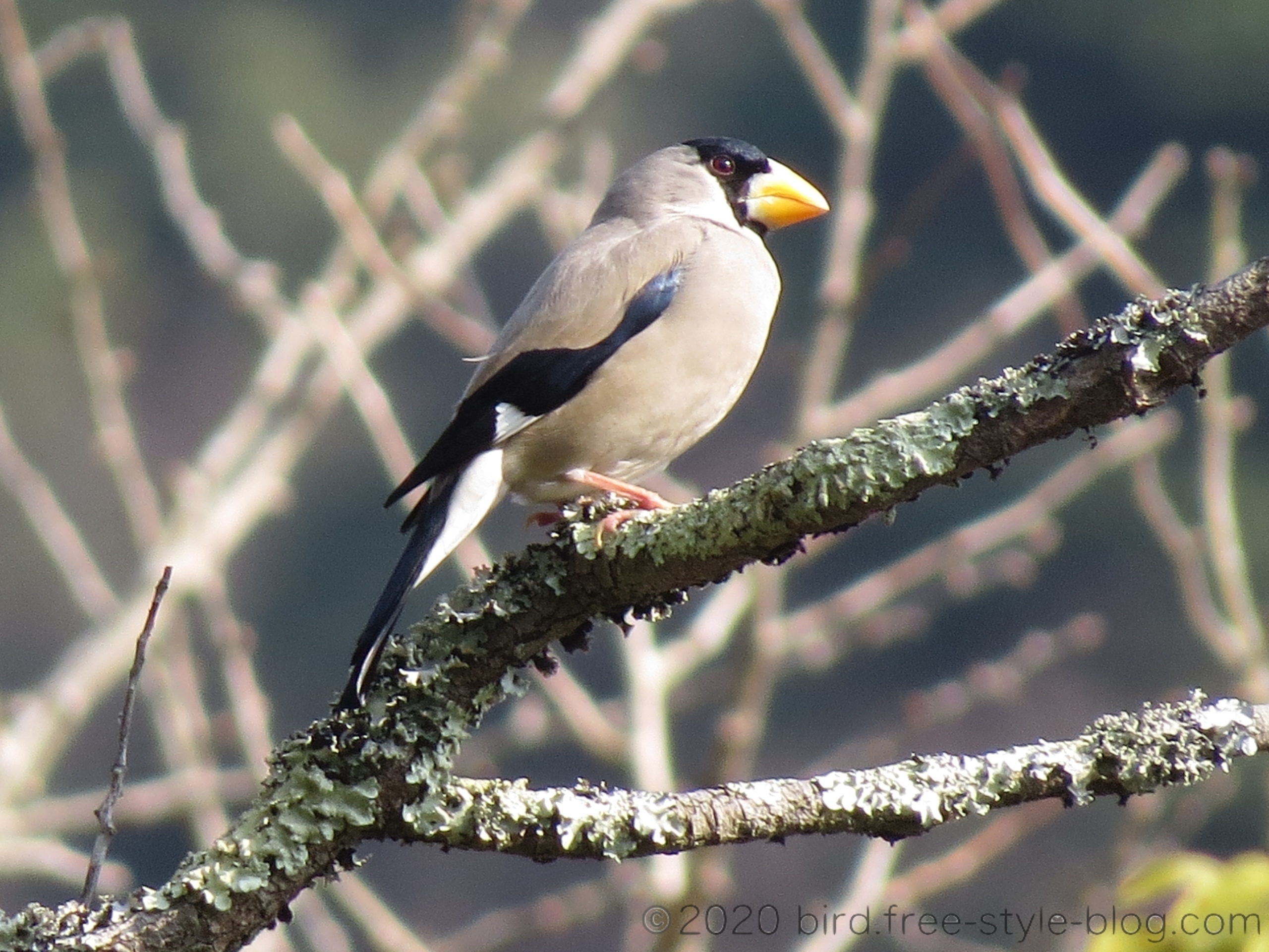 石見銀山を観光して、そろそろ帰ろうとしたところ、「キーコ、キーキー」と鳴き声がしたので上を見上げたところ、黄色い大きなクチバシを携え、凛々しい姿をしたイカルがいました。